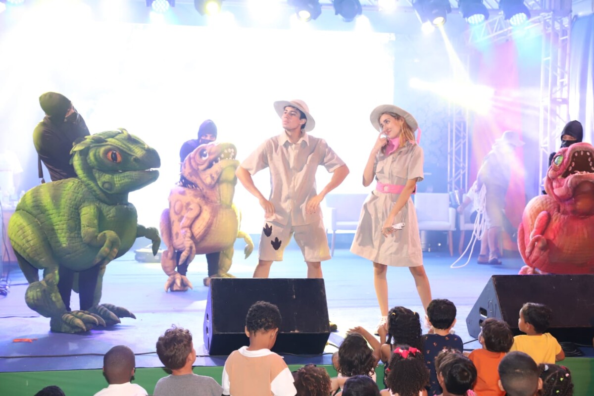 Neste sábado (28), o Palco Alegria da Feira Literária de Quissamã (Fliq) ofereceu uma experiência repleta de diversão com a apresentação infantil “Dino Thunder – Uma aventura jurássica”. O evento encantou as crianças ao mergulhar na emocionante história das aventuras de Pedro e Violeta, acompanhados por três simpáticos dinossauros, proporcionando uma atmosfera com música, atividades lúdicas e interação.
