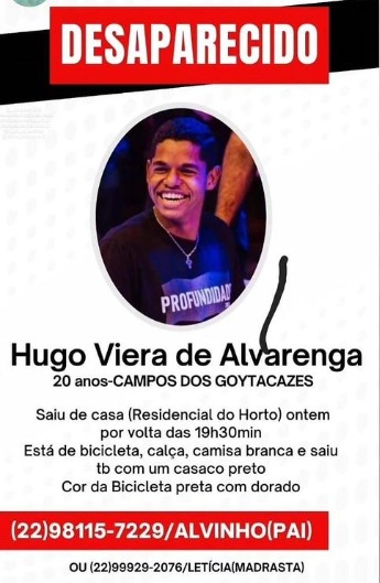 O jovem Hugo Vieira de Alvarenga, 20 anos, morador do bairro Horto, está desaparecido desde a noite da última terça-feira (14). Ele saiu de casa de bicicleta, usando calça, camisa branca e um casaco preto.