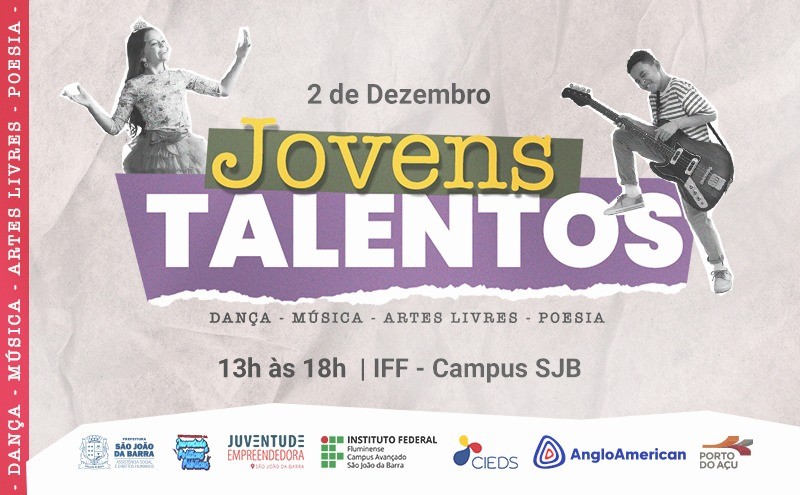 O Festival Jovens Talentos será realizado neste sábado, 2, no campus avançado do IFF-SJB, das 13h às 18h. O evento é aberto a toda população e vai contar com disputas nas categorias Dança, Música, Artes Livres e Poesia entre jovens de 15 e 29 anos que se inscreveram previamente nos editais. Juntamente ao festival, acontece a Feira de Negócios do projeto Juventude Empreendedora.