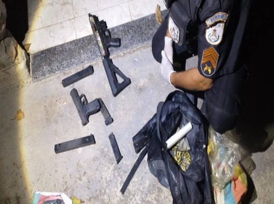 Militares fizeram buscas, mas os suspeitos não foram localizados. Durante as buscas foi encontrada, uma mochila contendo no seu interior uma pistola calibre 9mm, de fabricação turca, numeração suprimida, dois carregadores para pistola calibre 9mm, 123 munições cal. 9mm, uma submetralhadora artesanal cal. 9mm, dois carregadores alongados, duas munições cal. 40, um revólver cal.38, dez munições cal. 38 e duas munições cal. 380.