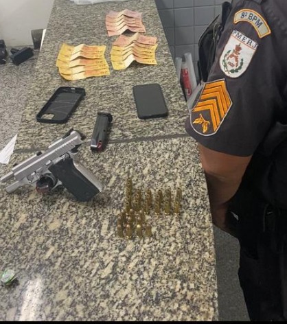 Na cintura dele os PMs encontraram uma pistola calibre 380 com 15 munições no carregador e no bolso da bermuda mais um carregador com outras 15 munições e R$ 245,00 em dinheiro.