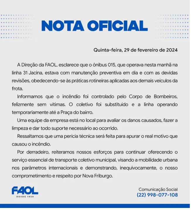 Confira a nota oficial da empresa responsável pelo ônibus: