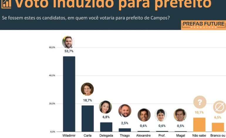 A primeira pesquisa registrada em Campos aponta que, se as eleições fossem hoje, o prefeito Wladimir Garotinho (PP) seria reeleito. No cenário induzido, quando os possíveis candidatos são apresentados, ele bate 53,7% das intenções de votos — na margem de erro, de 3,1 pontos para mais ou menos, ele ainda teria chance de liquidar a disputa no primeiro turno. A deputada estadual Carla Machado (PT), prefeita de São João da Barra por quatro mandatos, aparece na segunda posição, com 18,7%, seguida pela Delegada Madeleine (União), com 6,8%. O resultado da sondagem, realizada no dia 26 de abril, foi divulgado nesta sexta-feira (03).