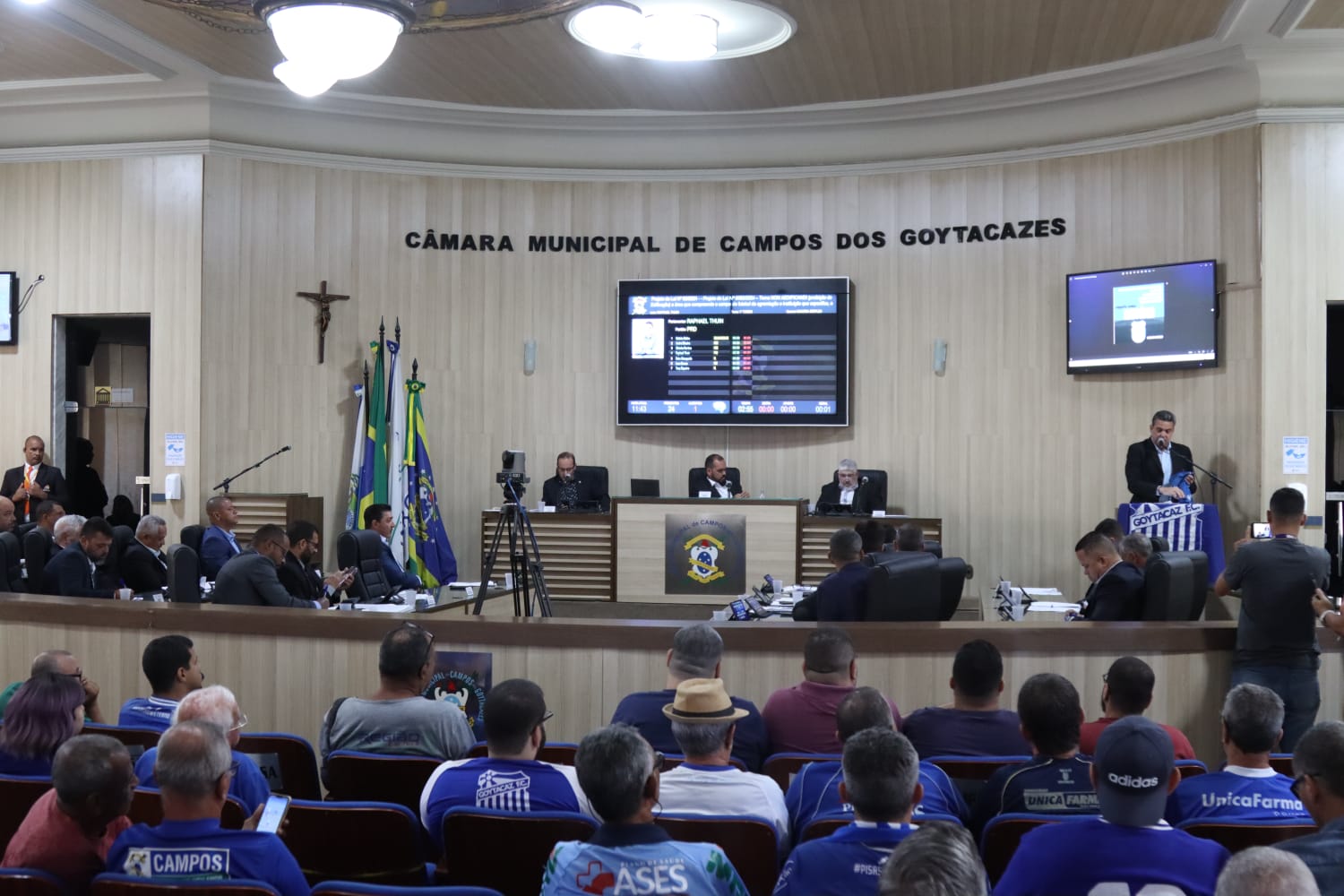 Em sessão ordinária realizada nesta terça-feira (18), a Câmara de Campos aprovou por unanimidade o Projeto de Lei do vereador Raphael Thuin (PTB), que visa proibir o terreno onde se localiza o campo de futebol do Goytacaz seja transformado em área “NON AEDIFICANDI” (área proibida de receber edificação). A medida foi tomada após o estádio Ary de Oliveira e Souza, o Aryzão, ser colocado em leilão três vezes. A torcida alvianil compareceu em bom número à Casa de Leis campista para acompanhar a votação.