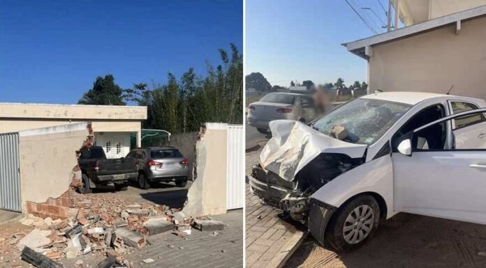 Parte do muro ficou destruída e a frente do carro sofreu danos significativos. Felizmente, ninguém se feriu.