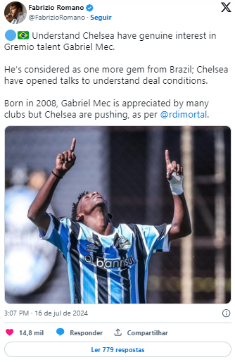O Chelsea, da Inglaterra, está em Porto Alegre para levar a joia campista de 16 anos Gabriel Mec, do Grêmio. Um grupo de representantes do clube inglês está acompanhados dos agentes do jogador, para formalizar uma proposta ao Tricolor do sul. O grupo acompanhará, nesta terça-feira (16), no CFT Hélio Dourado, a partida entre Grêmio e Cruzeiro, pelo Brasileirão sub-20.