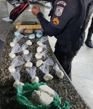A partir das informações repassadas, equipes policiais iniciaram um trabalho de inteligência para identificar e localizar a suspeita. Com o apoio de outras guarnições, a mulher foi abordada e detida. Durante a revista em sua bagagem, foram encontrados um tablete grande e outro pequeno de maconha, 17 invólucros de cocaína, além de um tablete maior da mesma substância e um aparelho celular.