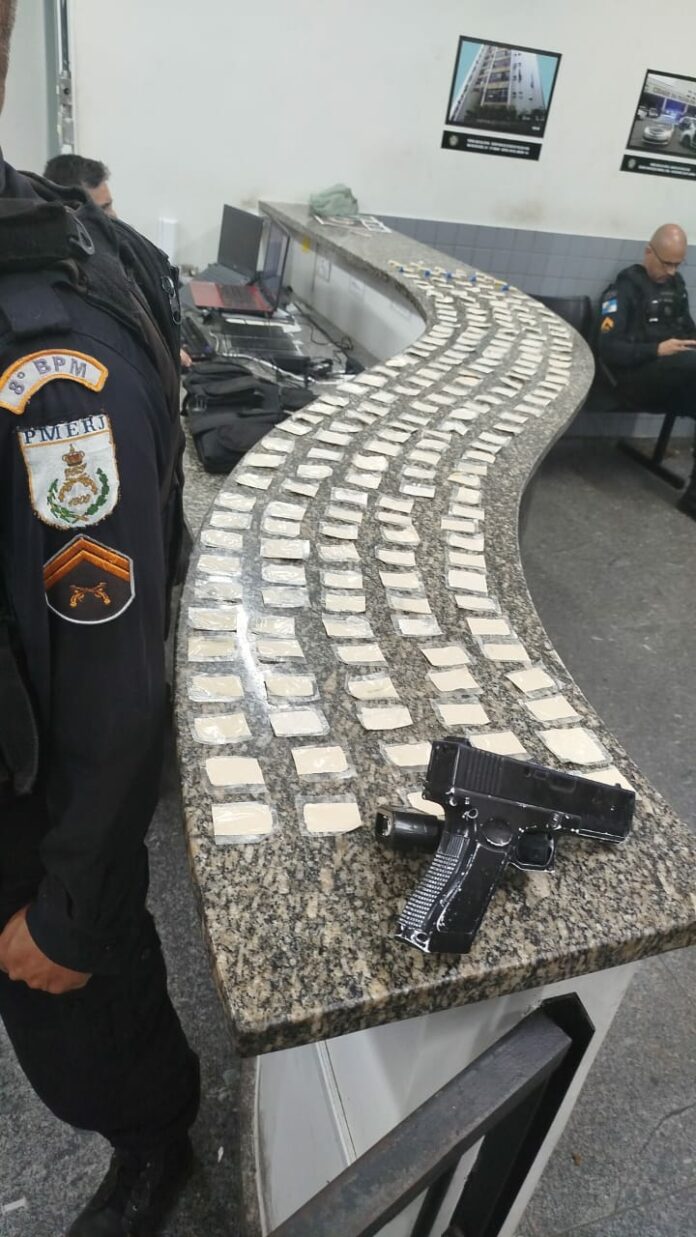 Na manhã desta segunda-feira (14), policiais do 8º Batalhão da Polícia Militar, vinculado ao 6º CPA, apreenderam drogas e um simulacro de arma de fogo, no bairro Brejo Grande, em Campos.