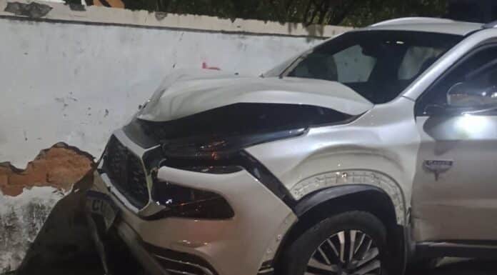 Colisão entre dois carros destrói muro e deixa dois feridos